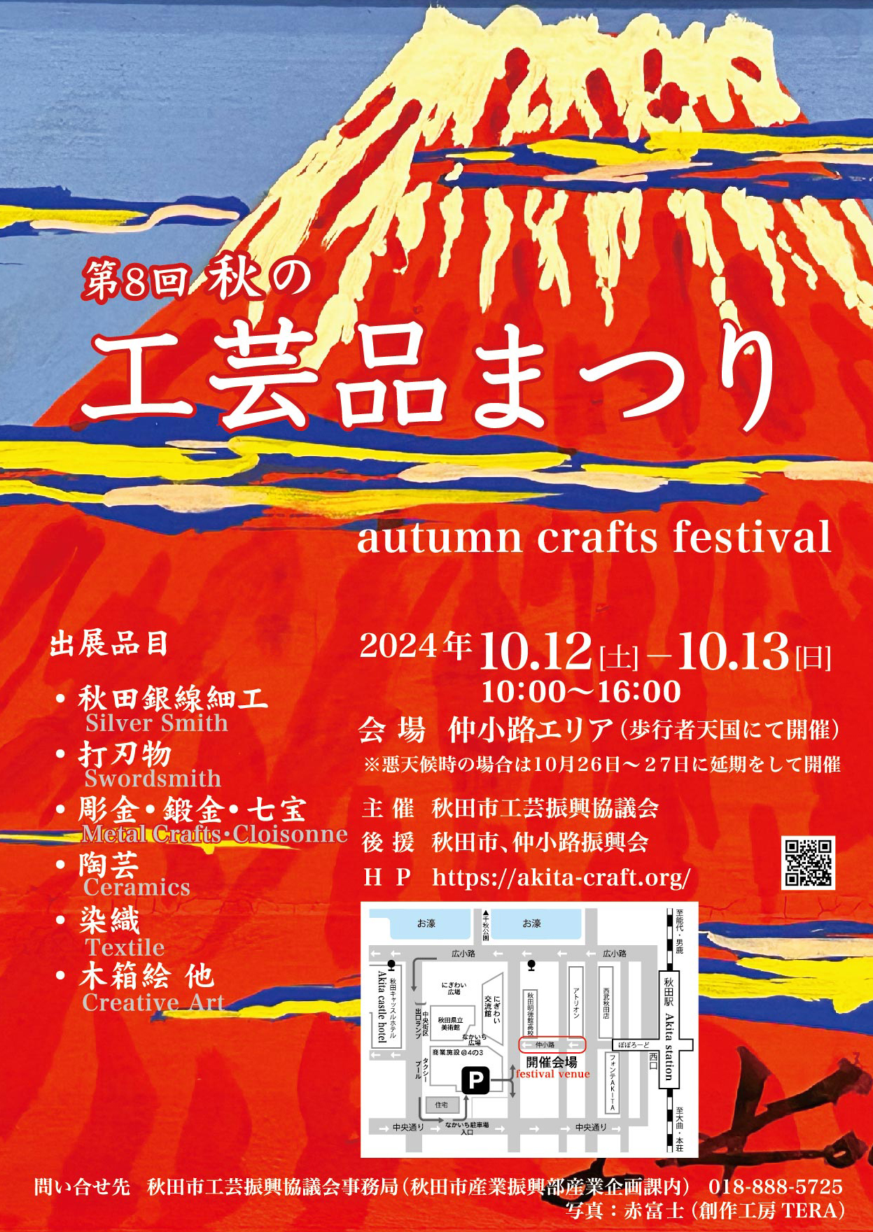 【会期】 令和6年10月12日(土)〜13日(日)10:00〜16:00 悪天候時は、令和6年10月26日(土)〜27日(日)に延期 入場無料 【場所】 秋田市仲小路路上 【出品】 秋田銀線細工、打刃物、七宝、陶芸、染色、創作アート 矢留彫金工房、正勝鍛治刃物、工房ジュエル、北手窯陶芸処、工房ぬくもり、創作工房TERA他 【企画】 体験コーナー:鍛金、藍染、絵付けなど(材料費をいただきます) |